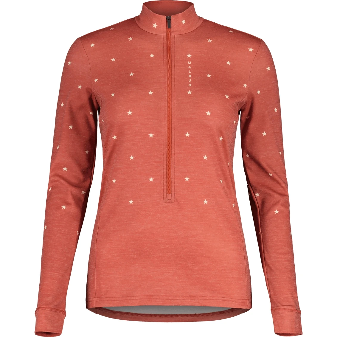 The elastic, quick-drying Thermopile Merino material is the ideal mid-layer for all outdoor adventures. Graphic Maloja lettering next to the front zipper and Happy Mountain woven label.